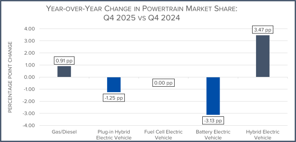 - Light truck sales represented 82 percent of the EV market, down 3 percentage points from Q3 2025.